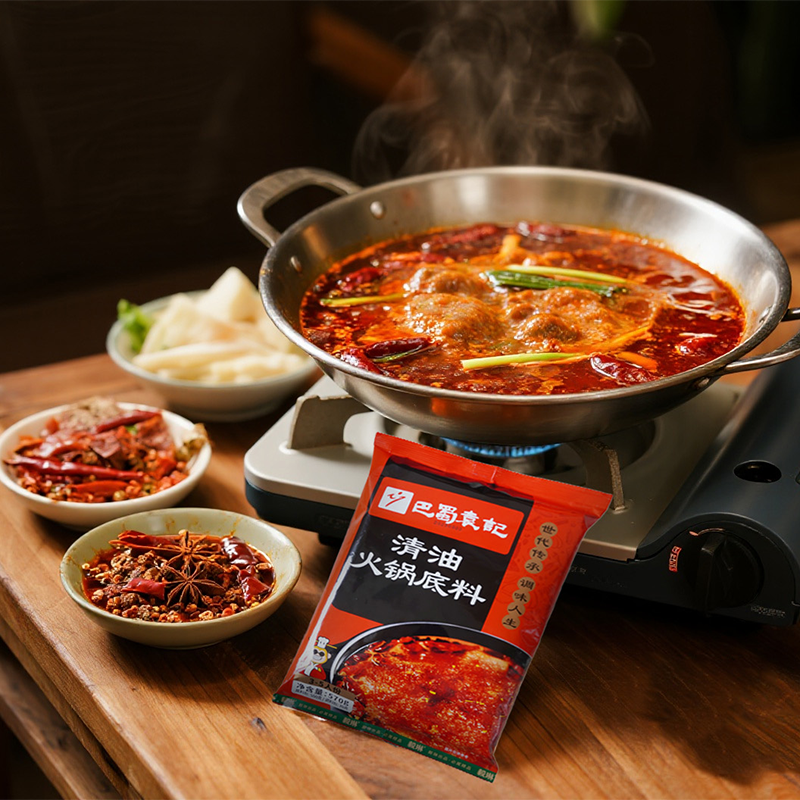 巴蜀袁记清油火锅底料使用非转基因菜籽油,精选多种天然香辛料为主要原料,采用先进的生产工艺加工而成;产品不使用添加剂,麻辣鲜香,传承巴蜀美食文化;本品不但可以烫火锅,还可用于炒菜、烧菜、干锅、串串香等,满足不同使用需求。