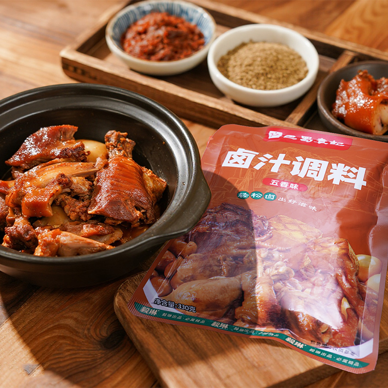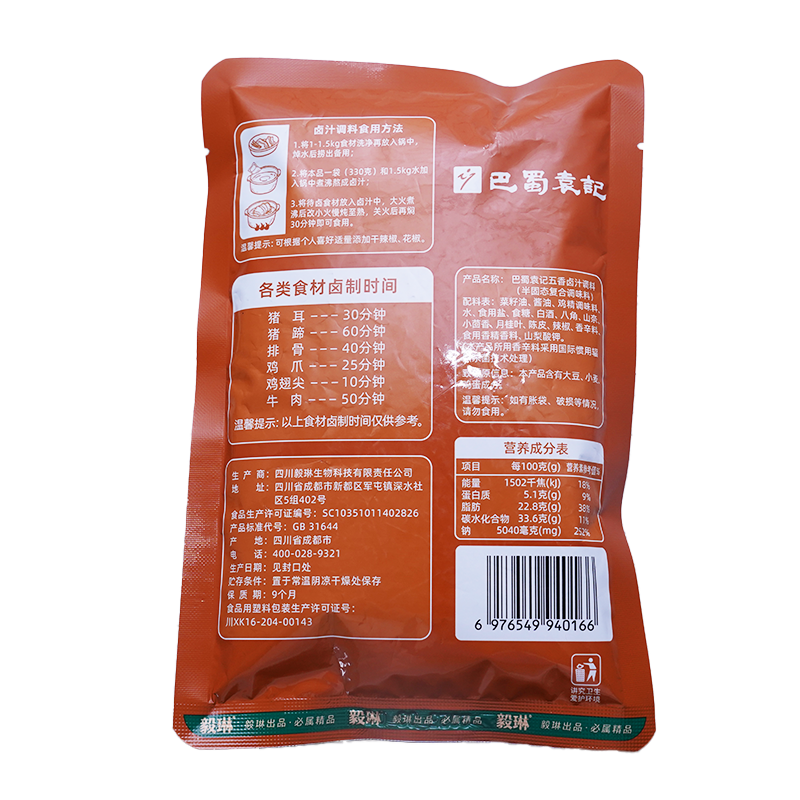 巴蜀袁记五香卤汁调料精选多种天然香辛料精心搭配,卤香浓郁,色泽鲜亮、加水即卤,轻松卤出好滋味;本品不但可以卤荤菜(鸡翅、鸡爪、鸭胗、猪耳等)、也可以卤素菜(土豆、藕、海带、花生等),可制作多种美食。